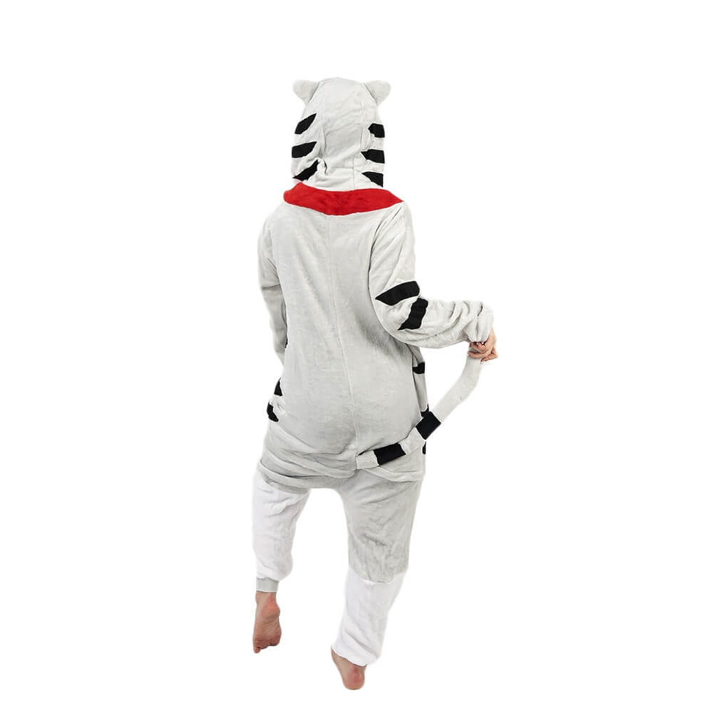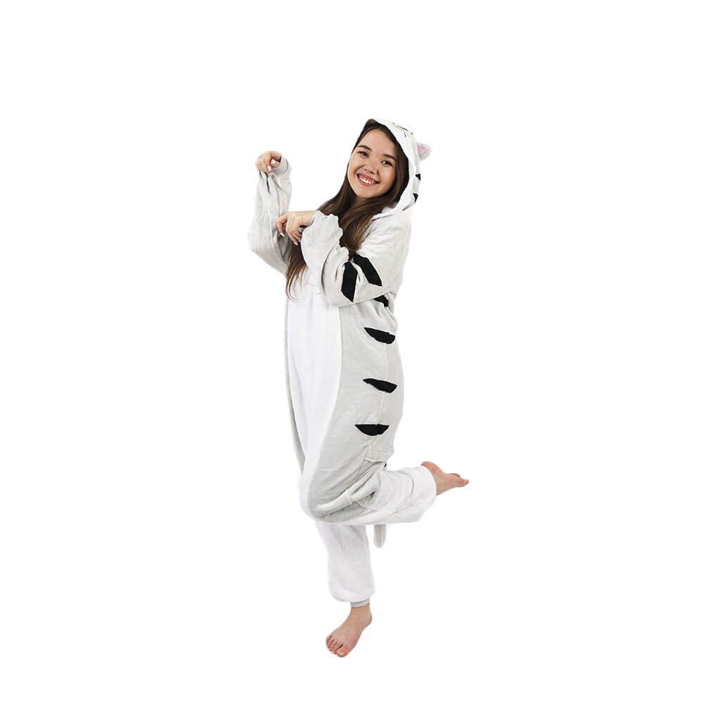 Котенок Чи – персонаж из мультфильма аниме. Кигуруми выполнен по мотивам этого мультфильма, а дизайн придает схожесть с персонажем. Бело-серая расцветка смотрится свежо и нарядно. Черные полосочки на хвосте, по бокам и на капюшоне придают игривости образу. Мордочка выполнена в технике аппликации с элементами вышивки.